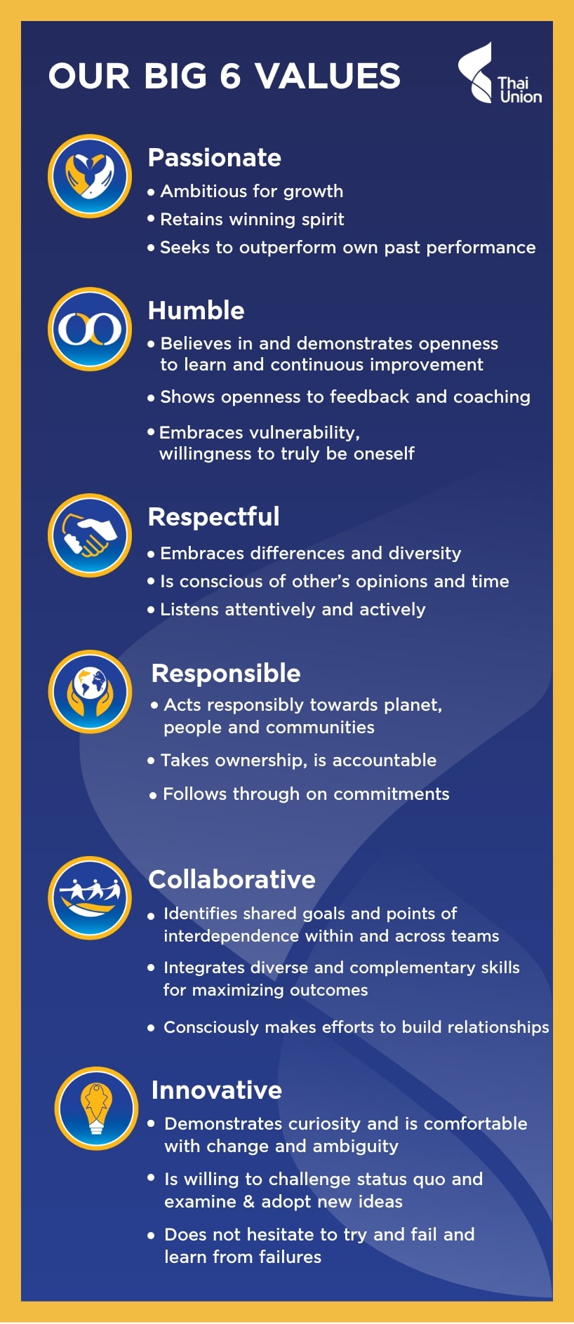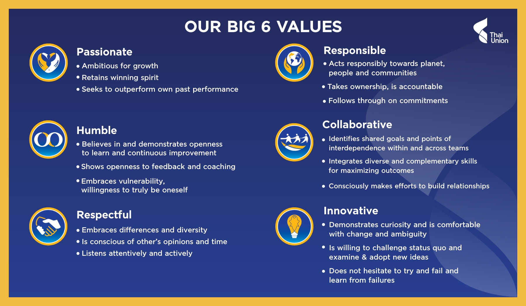Since our humble beginnings in Thailand 45 years ago, we have evolved into a truly multi-country and multi-cultural organization. Thai Union’s 6 Values were crafted to articulate our core beliefs, transcending the boundaries of national or regional belief systems. These values aim to define the behaviors we must embody in our intent, attitude, and actions.