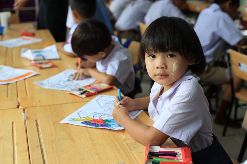 Caption: Students complete an assignment at Wat Yaichomprasat School in Samut Sakhon, where Thai Union opened a preschool for children of migrant workers. (Wichai Apiluxpoovadol/Thai Union)