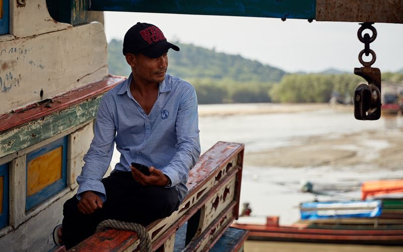 Caption: A fisherman is pictured using a mobile phone on a Thai fishing boat in southern Thailand, where Thai Union and Mars Petcare are implementing a digital traceability pilot program which will enhance human rights and provide workers with a voice at sea. Photo credit: Thai Union