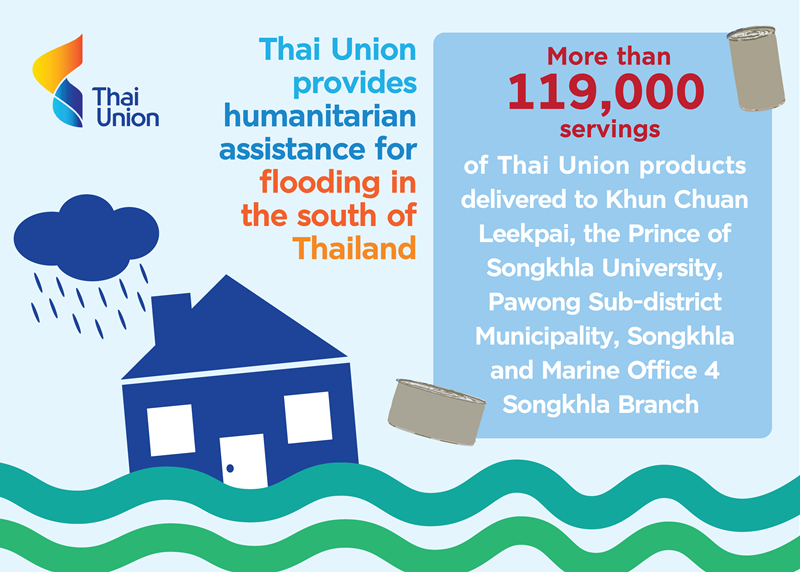 Thai Union Group PCL and its subsidiary, Songkhla Canning PCL have delivered more than 119,000 servings of seafood products for humanitarian relief to help people affected by flooding in southern Thailand. The donation, to those impacted by heavy rains across several provinces since last December, is in line with Thai Union’s commitment to support people living and working in communities where the company operates. The seafood products were distributed by a local authority, two local governments, a university and Mr. Chuan Leekpai, Speaker of the House of Representatives, to people mainly in Nakhon Si Thammarat and nearby areas, Pawong Sub-district Municipality Songkhla, Marine Office 4 Songkhla Branch and the Prince of Songkhla University.