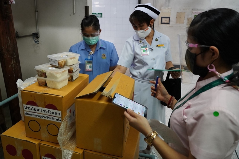 Caption: Nurses at Siriraj Hospital distribute 2,000 sets of Thai Union’s frozen ready-to-eat meals to the medical teams.