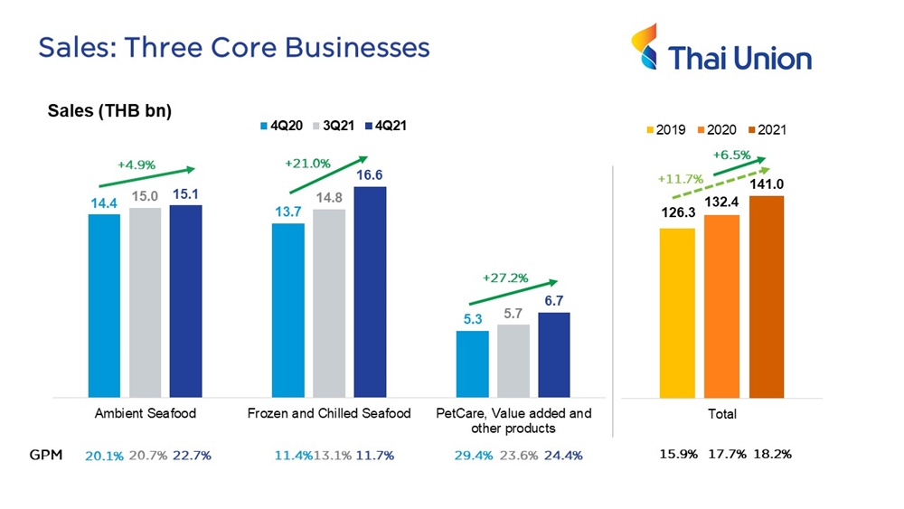 Sales during the fourth quarter of 2021 reached an all-time high of THB 38.5 billion, a 15.1 percent year-on-year increase, thanks to a rebound in the frozen and chilled seafood business following the reopening of food service, restaurants and hotels in the U.S. as COVID-19 restrictions eased. Continued strong sales from the PetCare and value-added business helped lift Thai Union’s fourth quarter net profit 32.5 percent to THB 1.9 billion, and came despite global supply chain disruptions.