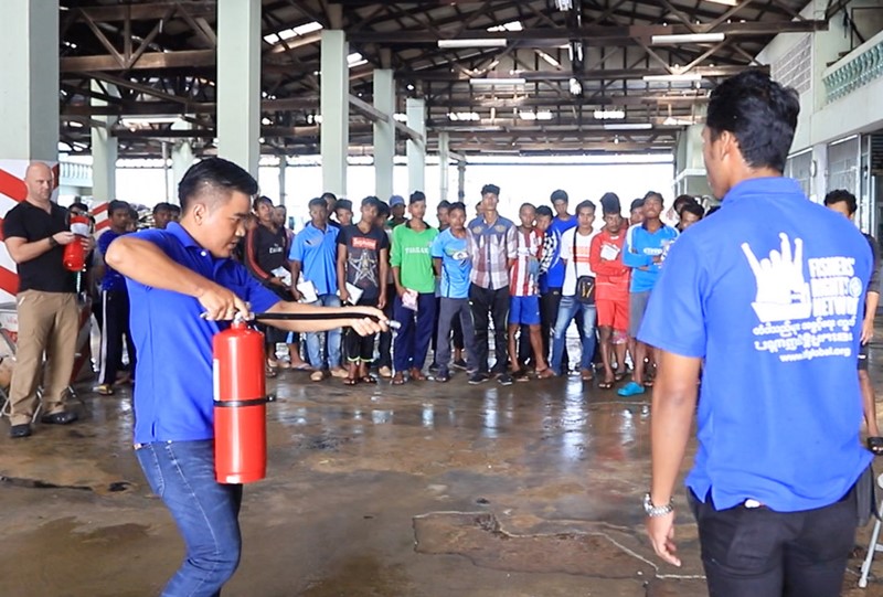 Caption: A member of the International Transport Workers' Federation (ITF) demonstrates how to properly utilize a fire extinguisher for a potential real-life emergency situation while at sea as fishers observe during a health and safety training workshop co-hosted by Thai Union and ITF in Chumphon, Thailand. Photo credit: Padungsak Vaiyavat/Thai Union