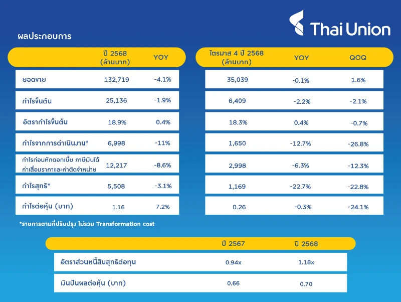 กรุงเทพฯ – 18 กุมภาพันธ์ 2569 – บริษัท ไทยยูเนี่ยน กรุ๊ป จำกัด (มหาชน) หรือ TU รายงานผลประกอบการปี 2568 ด้วยยอดขายรวม 132,719 ล้านบาท และปริมาณการขาย 908,436 แสนตัน เพิ่มขึ้น 2.5% จากปีก่อน เป็นผลจากการเติบโตของกลุ่มผลิตภัณฑ์อาหารทะเลแปรรูป อาหารทะเลแช่แข็ง และอาหารสัตว์เลี้ยง ขณะที่อัตรากำไรขั้นต้นขยายตัวทะลุ 18.9 % สูงสุดเป็นประวัติการณ์ สะท้อนความสามารถในการบริหารจัดการที่มีประสิทธิภาพและการปรับตัวอย่างรวดเร็ว โดยได้รับปัจจัยหนุนจากกลุ่มผลิตภัณฑ์อาหารทะเลแช่แข็งที่ดีขึ้นต่อเนื่อง ส่งผลให้กำไรจากการดำเนินงานตามที่ปรับปรุง โดยไม่รวม transformation cost อยู่ที่ 6,998 ล้านบาท พร้อมตั้งเป้าปี 2569 โต 3-4 % คาด GPM แตะ 19-20 %
