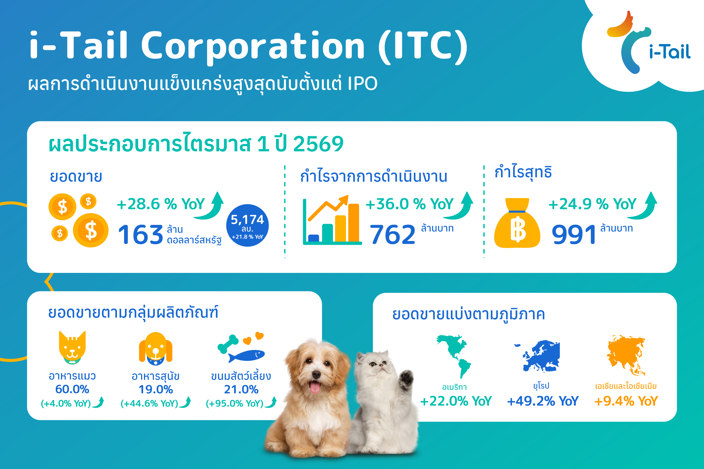 ITC ไตรมาส 1/69 ทุบสถิติโตสูงสุดเป็นประวัติการณ์ตั้งแต่ IPO กวาดยอดขาย 163 ล้านดอลลาร์สหรัฐ เติบโตทะลุ 28.6% ดันกำไรจากการดำเนินงานเพิ่มขึ้น 36% และกำไรสุทธิโต 24.9% รับปัจจัยหนุนกลุ่มสินค้าขนมสัตว