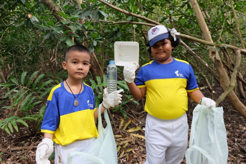 บรรยายภาพ: น้องๆ นักเรียนช่วยกันเก็บขยะตามชายฝั่งของป่าชายเลนระหว่างการทัศนศึกษาที่ศูนย์ส่งเสริมการเรียนรู้และพัฒนาทรัพยากรป่าชายเลนที่ 2 สมุทรสาคร ซึ่งจัดขึ้นโดยไทยยูเนี่ยน (เครดิตภาพโดย ไทยยูเนี่ยน)