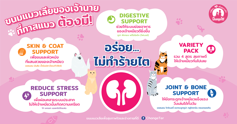 ChangeTer คือขนมแมวเลียที่นอกจากจะอร่อยแล้วยังไม่ทำร้ายไต คิดค้นโดยนักวิทยาศาสตร์และนักโภชนาการเพื่อให้บรรดาทาสแมวมั่นใจได้ว่าเวลาเล่นให้ขนมเจ้าเหมียวทานนั้น นอกจากพวกเขาจะได้รับสารอาหารที่ดีมีประโยชน์แล้ว ทาสแมวยังมั่นใจไร้กังวลไม่ต้องห่วงหรือรู้สึกผิดเวลาเล่นให้ขนมกับสมาชิกสี่ขาในบ้าน