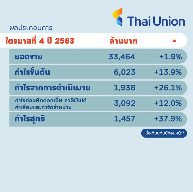 ไทยยูเนี่ยนรายงานผลประกอบการไตรมาสที่ 4 ปี 2563 มียอดขายอยู่ที่ 33,464 ล้านบาท เพิ่มขึ้น 1.9 เปอร์เซ็นต์เมื่อเทียบกับไตรมาสสุดท้ายของปีก่อนหน้า และกำไรจากการดำเนินงานอยู่ที่ 1,938 ล้านบาท สูงขึ้น 26.1 เปอร์เซ็นต์ ในขณะที่กำไรสุทธิอยู่ที่ 1,457 ล้านบาท เพิ่มขึ้น 37.9 เปอร์เซ็นต์