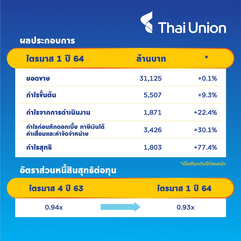 โดยในไตรมาสแรกไทยยูเนี่ยนรายงานผลกำไรสุทธิอยู่ที่ 1,803 ล้านบาท มากกว่าไตรมาสเดียวกันของปีก่อนหน้าถึง 77 เปอร์เซ็นต์ และมียอดขายคงที่อยู่ที่ระดับ 31,125 ล้านบาท เพิ่มขึ้นเพียง 0.1 เปอร์เซ็นต์เมื่อเทียบกับปีก่อนหน้า ผลกำไรสุทธิเพิ่มขึ้นจากธุรกิจอาหารทะเลแช่แข็งฟื้นตัว โดยเฉพาะในตลาดสหรัฐอเมริกา และธุรกิจผลิตภัณฑ์อาหารสัตว์เลี้ยงและผลิตภัณฑ์เพิ่มมูลค่า ประกอบกับการบริหารจัดการต้นทุนที่ดีและได้รับผลดีจากอัตราแลกเปลี่ยนเงินตรา
