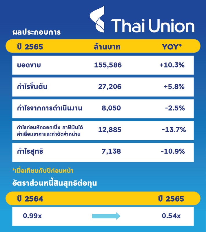 ผลงานในไตรมาสสุดท้ายของปีมียอดขาย 39,613 ล้านบาทเพิ่มขึ้น 2.9 เปอร์เซ็นต์และกำไรจากการดำเนินงาน 2,384 ล้านบาทเพิ่มขึ้น 20.6 เปอร์เซ็นต์ ส่งผลให้ไทยยูเนี่ยนเผยยอดขายตลอดปี 2565 เพิ่มขึ้น 10.3 เปอร์เซ็นต์ อยู่ที่ 155,586 ล้านบาท สูงสุดเป็นประวัติการณ์ และมีกำไรขั้นต้นอยู่ที่ 27,206 ล้านบาท เพิ่มขึ้น 5.8 เปอร์เซ็นต์เมื่อเทียบกับปีก่อนหน้า ขณะที่กำไรสุทธิประจำปี 2565 อยู่ที่ระดับ 7,138 ล้านบาท ลดลง 10.9 เปอร์เซ็นต์ แต่บริษัทยังสามารถจ่ายปันผลครึ่งปีหลังอยู่ที่ 0.44 บาทต่อหุ้น ทำให้เงินปันผลตลอดปีอยู่ที่ 0.84 บาทต่อหุ้น และบริษัทยังคงจ่ายอัตราเงินปันผลตอบแทนในระดับดีต่อเนื่องอยู่ที่อัตรา 5.3 เปอร์เซ็นต์