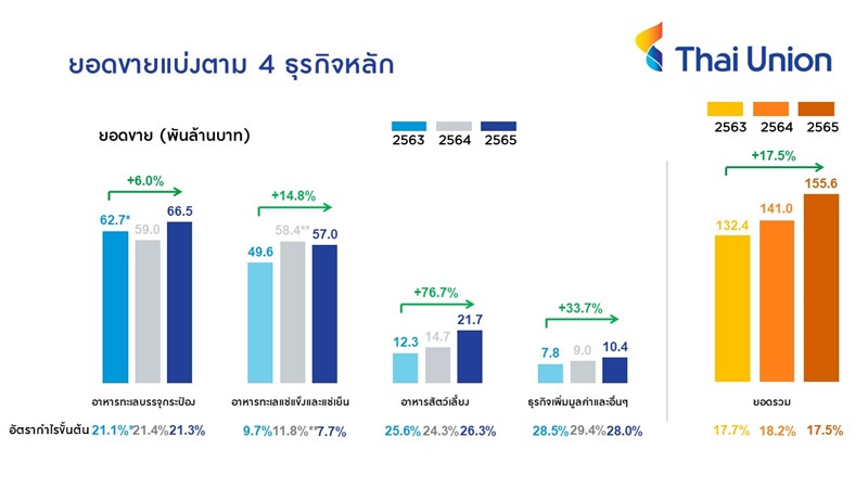 ในปี 2565 ยอดขายจากธุรกิจอาหารทะเลบรรจุกระป๋องเพิ่มขึ้น 12.8 เปอร์เซ็นต์ จากราคาขายที่เพิ่มขึ้นและความต้องการสินค้าที่สูงขึ้นอย่างต่อเนื่อง โดยเฉพาะในเอเชียและสหรัฐอเมริกาที่มีการปล่อยสินค้านวัตกรรมใหม่ ๆ ที่ตรงใจผู้บริโภค สำหรับธุรกิจอาหารสัตว์เลี้ยงยังคงทำผลงานได้ดี ด้วยยอดขายที่เพิ่มขึ้น 48.0 เปอร์เซ็นต์จากปี 2564 อยู่ที่ 21,693 ล้านบาท จากความต้องการอาหารสัตว์ที่พุ่งสูงและราคาขายที่เพิ่มขึ้น