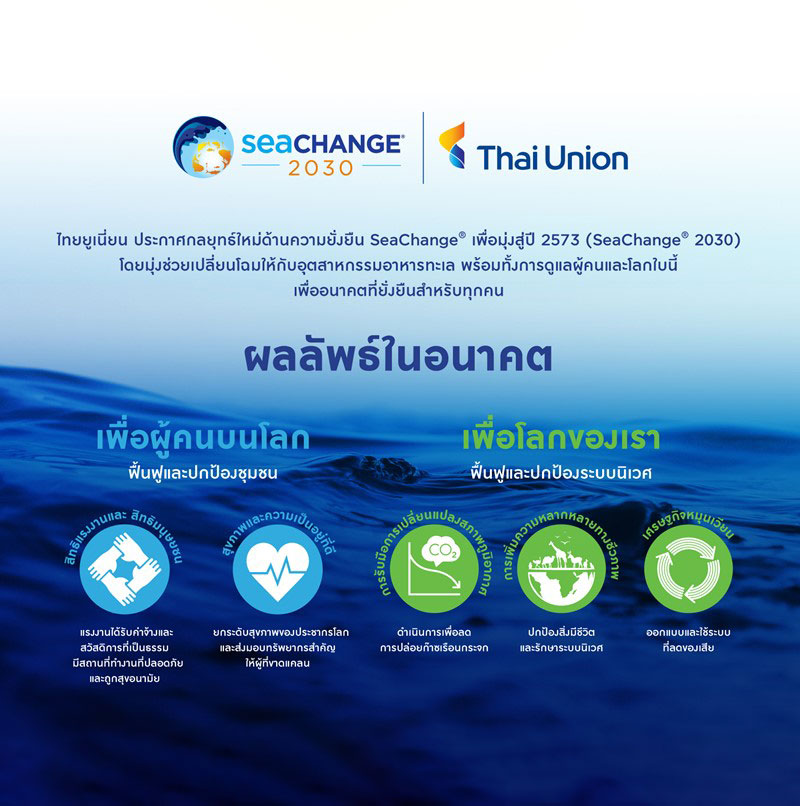 ทั้งนี้ ไทยยูเนี่ยนได้ประกาศกลยุทธ์ความยั่งยืน SeaChange® ครั้งแรกเมื่อปี 2559 ซึ่งเป็นกรอบการทำงานด้านความยั่งยืนที่ทำให้บริษัทได้รับการยอมรับในระดับสากล รวมถึงการได้รับการจัดอันดับในดัชนีความยั่งยืนดาวโจนส์ถึง 9 ปีติดต่อกันและเป็นอันดับ 1 ในประเภทผลิตภัณฑ์อาหารถึง 3 ปีด้วยกัน นอกจากนี้บริษัทยังได้รับการจัดอันดับจากดัชนี Seafood Stewardship Index เป็นอันดับที่ 1 สำหรับการทำงานตอบโจทย์เป้าหมายการพัฒนาที่ยั่งยืนโดยองค์การสหประชาชาติ