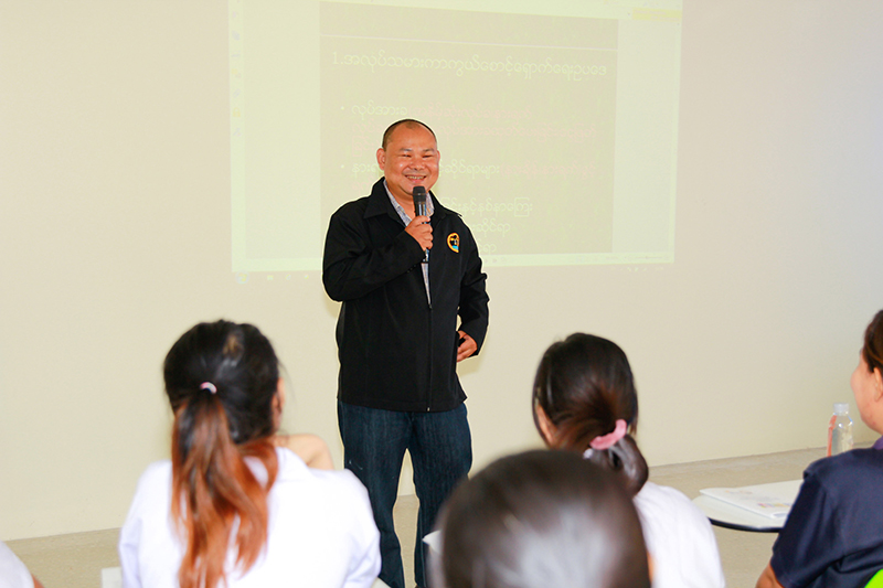 นายซิน เท ประธานกรรมการบริหาร เครือข่ายสิทธิแรงงานข้ามชาติ ให้เกียรติมาเป็นวิทยากรในการอบรม โดยมีพนักงานแรงงานของไทยยูเนี่ยนเข้าอบรมจำนวน 63 คน (ภาพจากไทยยูเนี่ยน/ธวัชชัย พันเดช)
